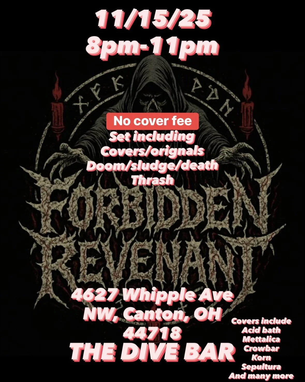 Come out to The Dive on Saturday, November 15th from 8pm-11pm for live music with Forbidden Revenant and some special guests - NO COVER!
