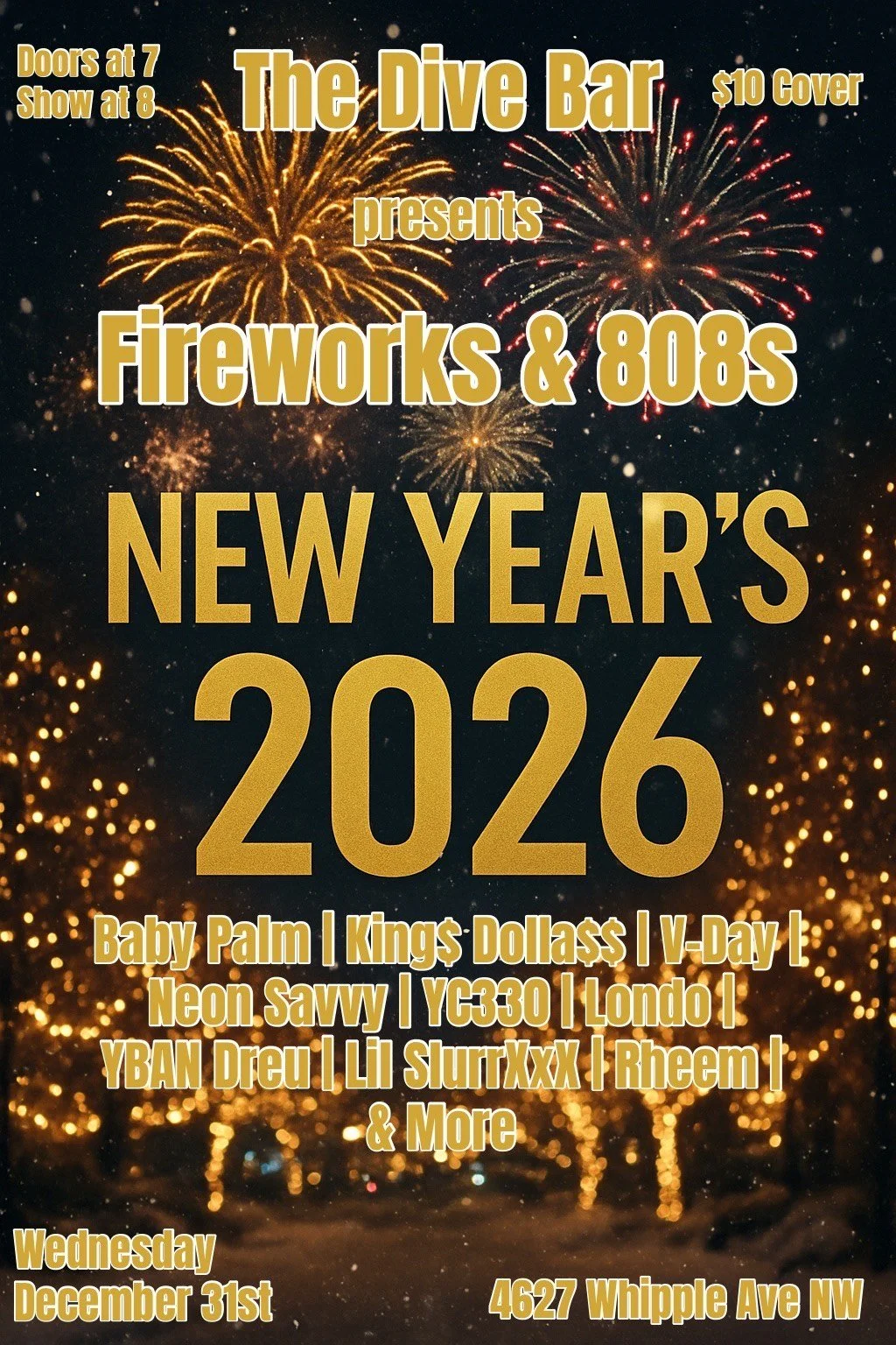 Join us for a special NYE show - Fireworks & 808s - with Rheem and special guests Baby Palm, King$ Dolla$$, V-Day, Neon Savvy, YC330, Londo, YBAN Dreu, Lil SleurXxX, & More!